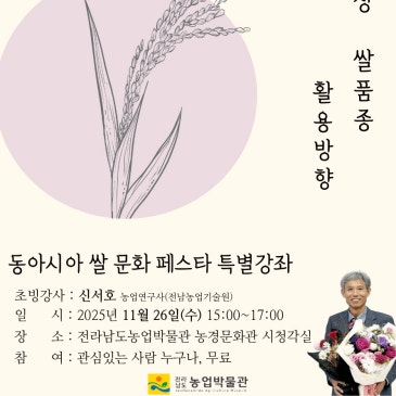 신서호 농업연구사, 미래 쌀 산업의 혁신 모델 제시 전라남도농업박물관은 26일 오후 3시 ‘동아시아 쌀 문화 페스타’ 다섯 번째 특별강좌를 열어 국내 대표 쌀 품종 개발 전문가를 초청해 미래 쌀 산업의 혁신 모델을 제시한다고 밝혔다. 이번 강좌는 농경문화관 시청각실에서 ‘가공 기능성 쌀 품종 활용 방향’을 주제로 열린다. 초청 강연자는 신서호 전남도농업기술원 농업연구사다. 신서호 농업연구사는 강의에서는 최근 가공 기능성 쌀 품종 개발 동향, 쌀의 다양한 활용 방향, 현장 농가 적용 사례 및 성공 노하우를 소개할 예정이다. 쌀 산업의 부가가치 창출, 농업 현장의 변화, 지속가능성 모색 등 다양한 이슈에 대한 깊이 있는 이…….